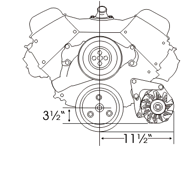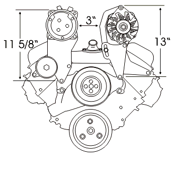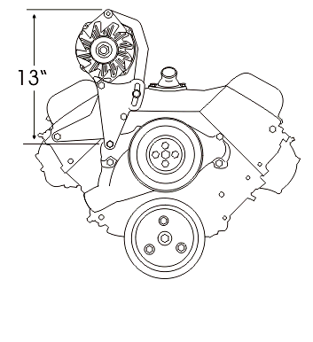 LOW ALT.Mounts the alternator low on the drivers side. A very strong lower bracket with a lot of adjustment. Check the dimension requirements before ordering. |