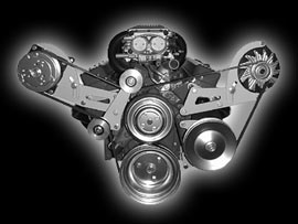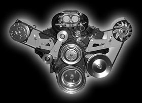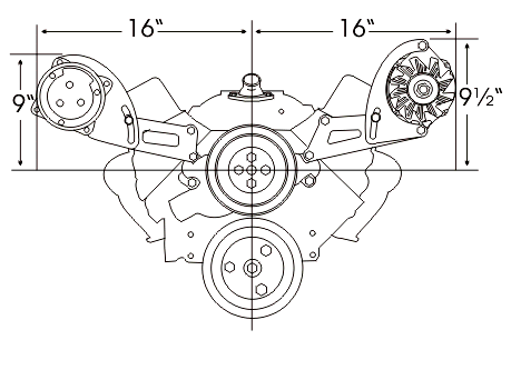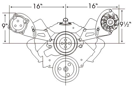 Designed for cars with low hood clearance and wide engine compartments -- trucks, 50-60's cars, even Vettes and Camaros. These brackets bolt to the head and top water pump bolt holes. The alternator bracket will fit all 1969 and newer heads. The compressor bracket is designed to be used with 1987 and later cast iron heads including the popular Vortec. Bracket comes complete with idler assembly and CNC machined aluminum idler pulleys with double row bearings. Part Number: 308- A.C. & Alt. |