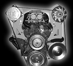 Designed for cars with low hood clearance and wide engine compartments -- trucks, 50-60's cars, even Vettes and Camaros. These brackets bolt to the head and top water pump bolt holes. The alternator bracket will fit all 1969 and newer heads. The A.C. compressor bracket fits all G.M. aluminum heads and may be used on 1969 thru 1986 cast iron heads by drilling and tapping one hole for the upper mounting point. Bracket comes complete with idler assembly and CNC machined aluminum idler pulleys with double row bearings. |
