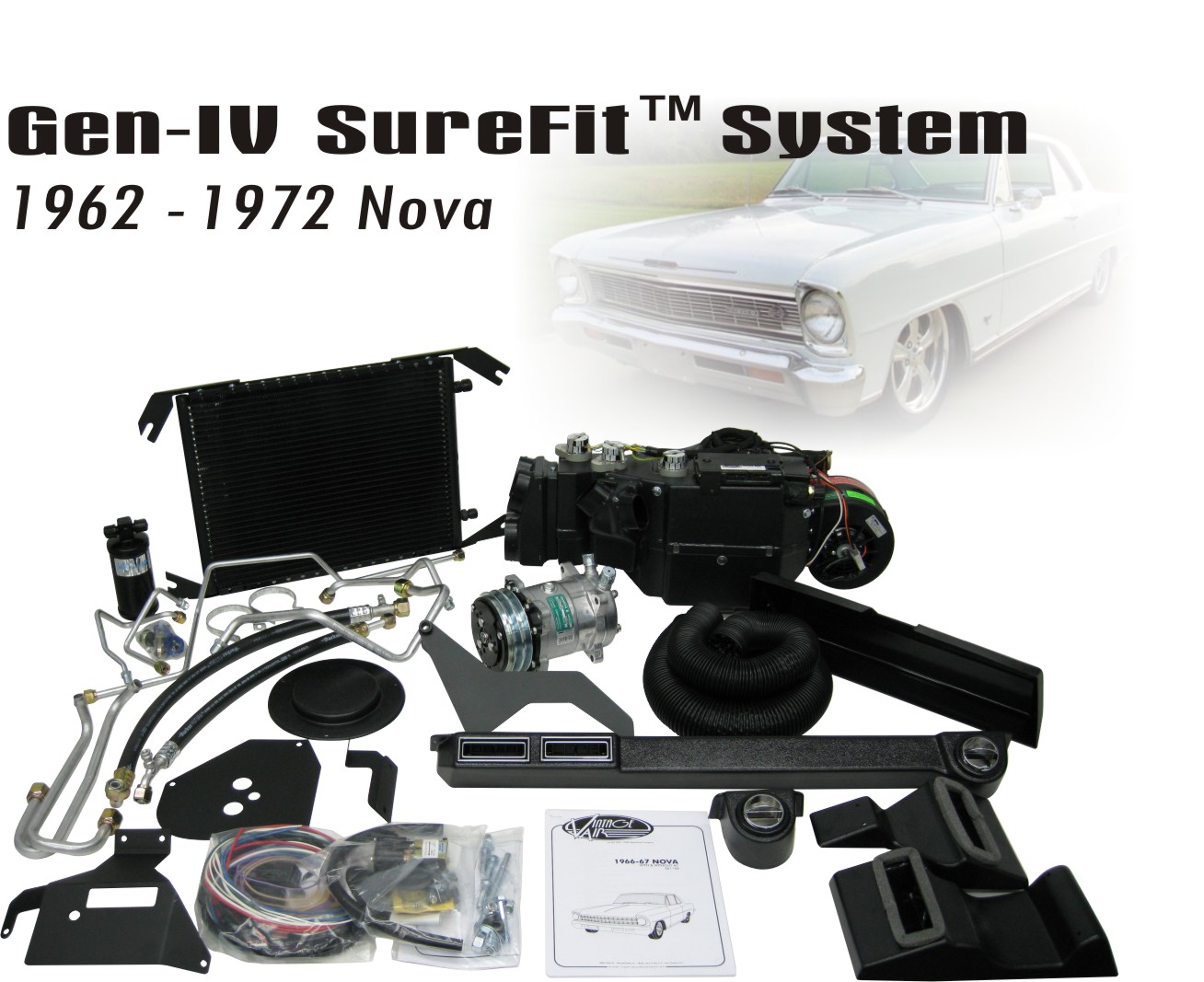 The Gen IV™ is Vintage Air’s most powerful and intelligent climate control system. The Gen IV uses an exclusive fully electronic microprocessor control system eliminate cables or vacuum connections. Separate high capacity copper parallel-flow heat coil and aluminum plate and fin cooling coils provide outstanding performance and instant temperature adjustments. This new Nova Sure Fit™ system includes our exclusive Rotary Electronic Controls for the 1962-65 Kit and Electronic Cable Converters™ which convert existing factory controls to electronic operation for the 1966-1972 Kits. Additional features include variable blower speed and dash/floor/defrost blend. SureFit Systems™ are engineered specifically for each vehicle application and require absolutely minimal alteration to the vehicle for installation.