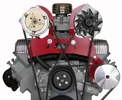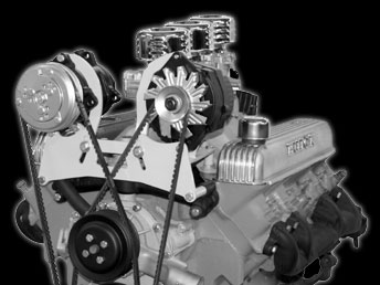 Due to the renewed intrest in nostalgia motors we have designed a bracket for the 401/425 Nailhead Buick. Steel bracket mounts to the intake and water crossover manifold. Two groove water pump and crankshaft pulleys are required for this application. |
