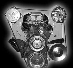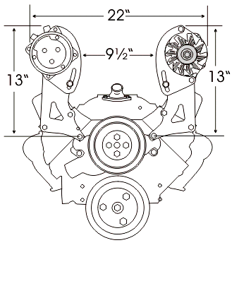 Designed for cars with low hood clearance and wide engine compartments -- trucks, 50-60's cars, even Vettes and Camaros. These brackets bolt to the head and top water pump bolt holes. The alternator bracket will fit all 1969 and newer heads. The compressor bracket is designed to be used with 1987 and later cast iron heads including the popular Vortec. Bracket comes complete with idler assembly and CNC machined aluminum idler pulleys with double row bearings. Part Number: 308- A.C. & Alt. |